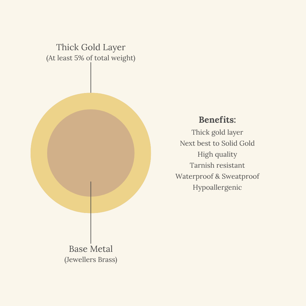 A thick layer of solid 14k gold (at least 5% of the jewellery's total weight) is permanently bonded to a durable base metal, jewellers brass, making it significantly more resistant to tarnishing and discolouration than gold-plated or vermeil pieces. Hypoallergenic, waterproof and long-lasting, gold-filled jewellery is the next best option to solid gold.