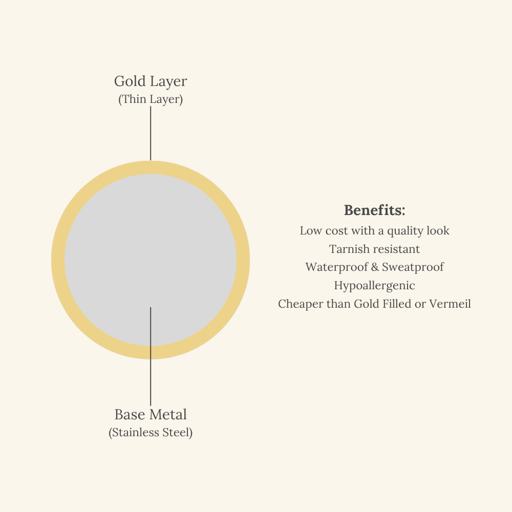 A thick, durable layer of gold is bonded to stainless steel through an advanced vacuum coating process creating a finish that is significantly more resistant to tarnishing, fading than general electroplated jewellery. It is waterproof, sweatproof, hypoallergenic and highly durable. A great alternative to gold vermeil and gold filled jewellery.